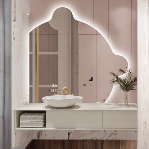 Smart Infinity specchio bagno irregolare in legno incorniciato inciso salone magico ha condotto luce decorativa da bagno specchi